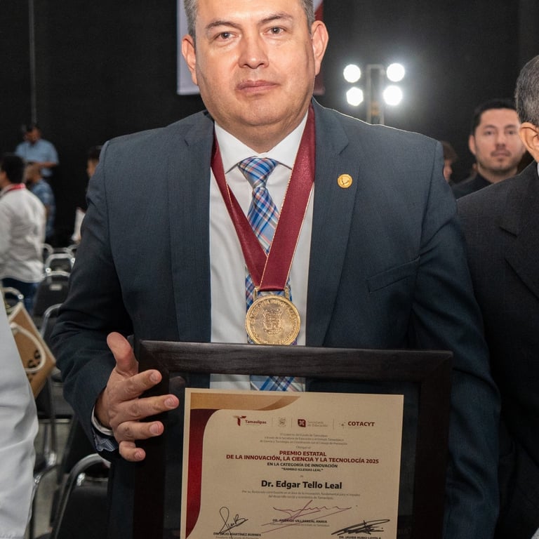 El investigador de la Universidad Autónoma de Tamaulipas (UAT), Edgar Tello Leal, recibió el Premio Estatal de la Innovación, la Ciencia y la Tecnología 2025, en la categoría Innovación “Ramiro Iglesias Leal”, en el marco del Certamen Estatal de Creatividad e Innovación Tecnológica-Expo Ciencias Tamaulipas 2025.